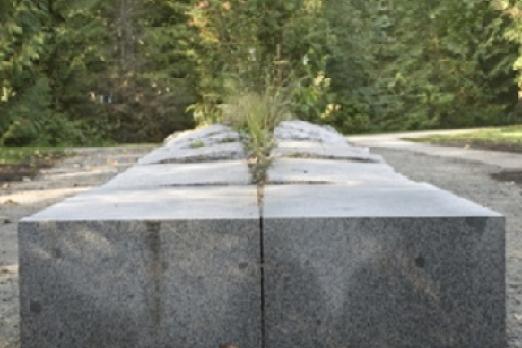 This artwork is positioned at the south end of William Griffin parking lot on the west side of the foot bridge over the river. Working with the theme of city grid to natural patterning, the artist laid out ten large granite blocks, in a linear grid-like pattern. As the blocks advance away from the city they physically transform from smooth cubes to rough naturalized formations. The native trees interwoven into the piece will interact with the slabs causing heaving and cracking over time.